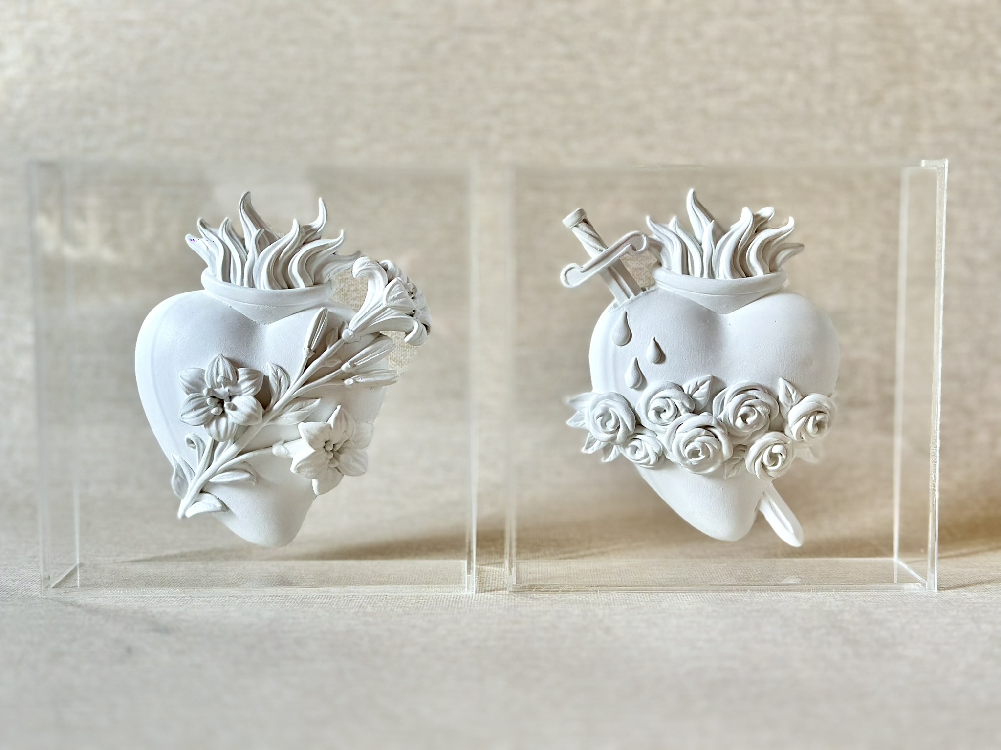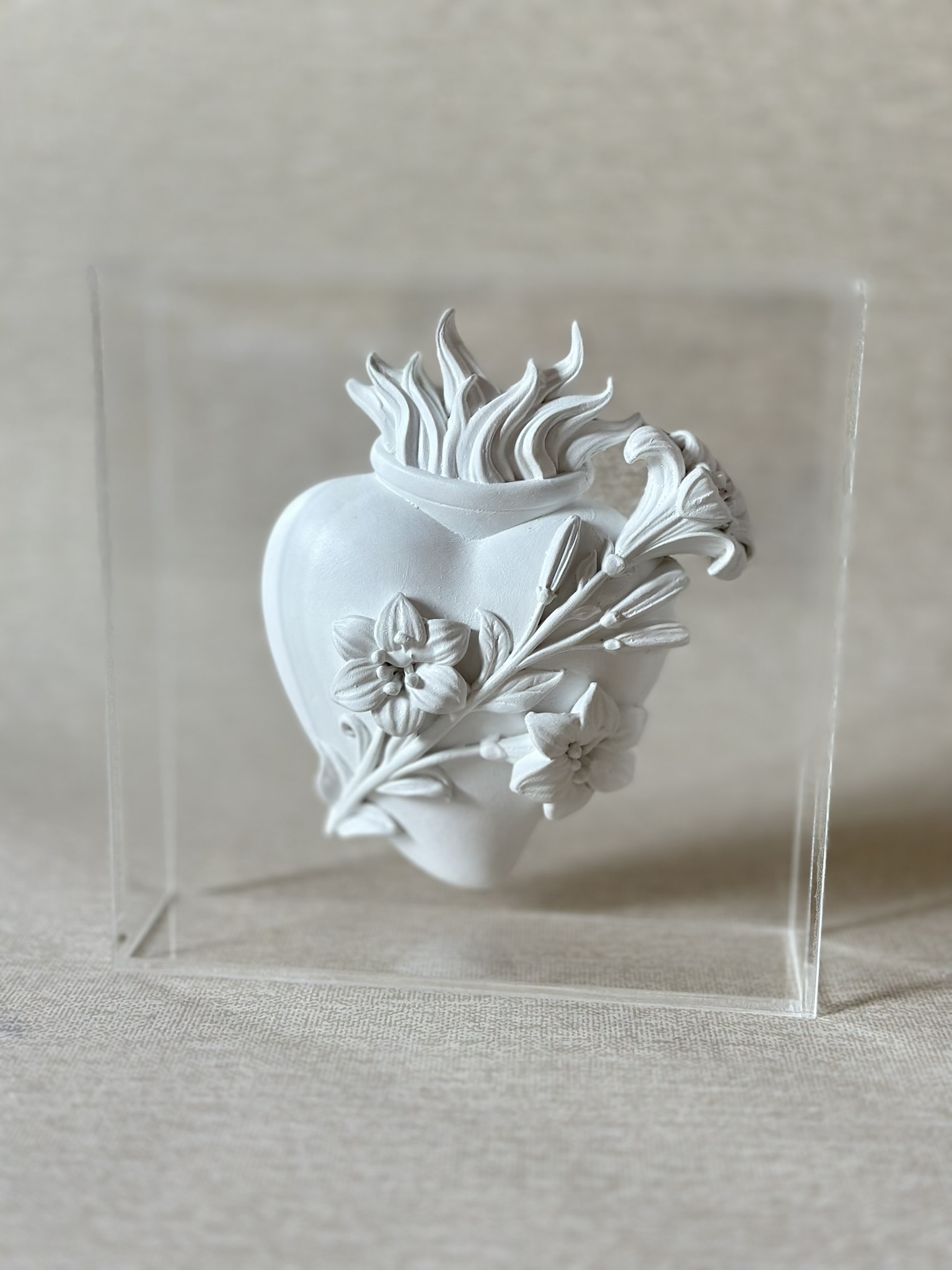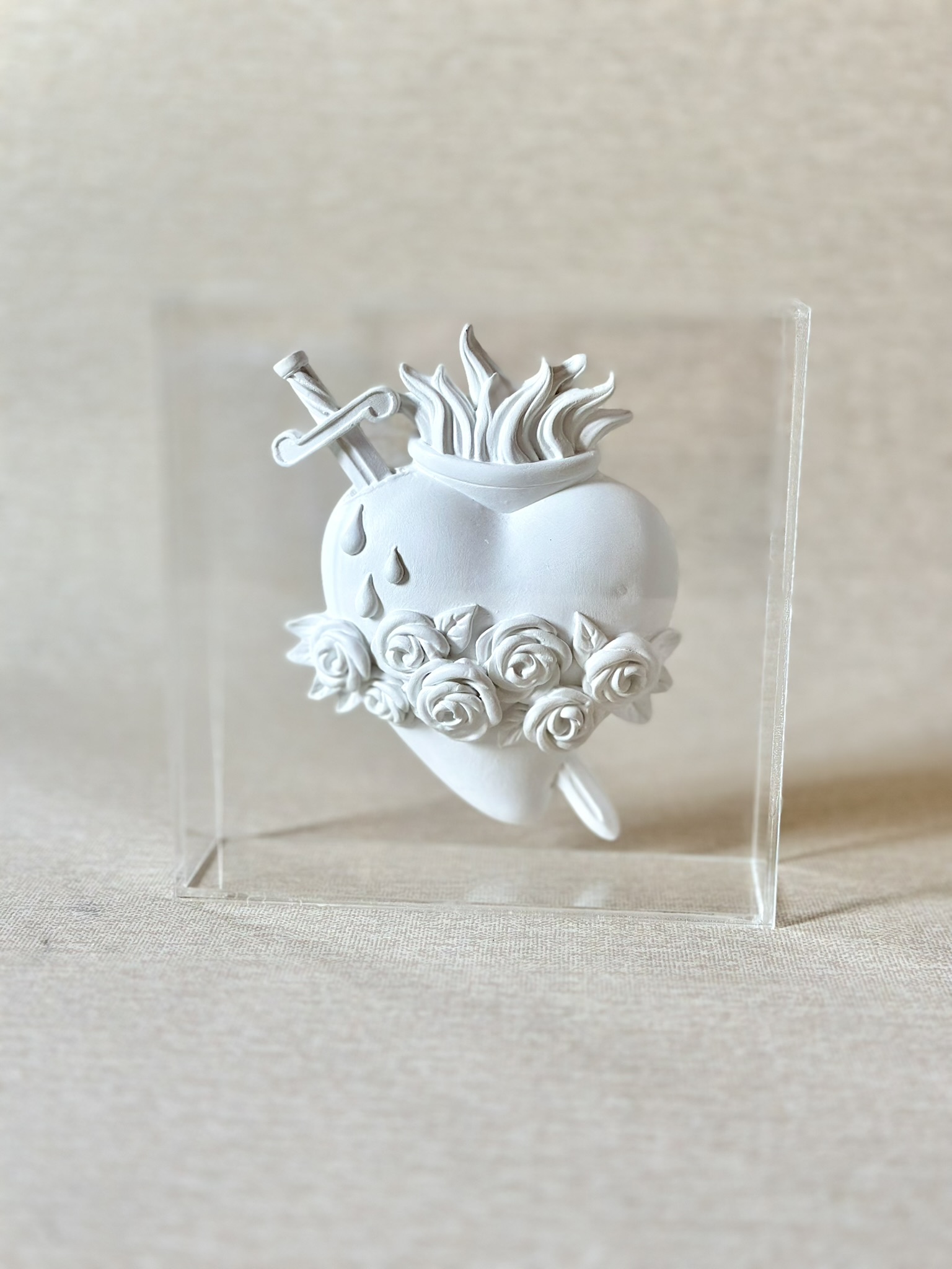 Box feito acrílico transparente com medalha de resina de Sagrado Coração de Maria, de Jesus ou de José com 13cm branca.