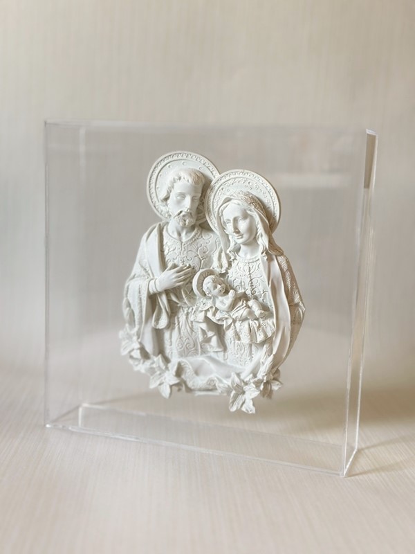 Box feito acrílico transparente com medalha de resina de Sagrada Família de 20cm branca. O Box tem 23cm x 23cm por 5cm de profundidade e você pode optar por colocar o gancho atrás para pendurar na parede.