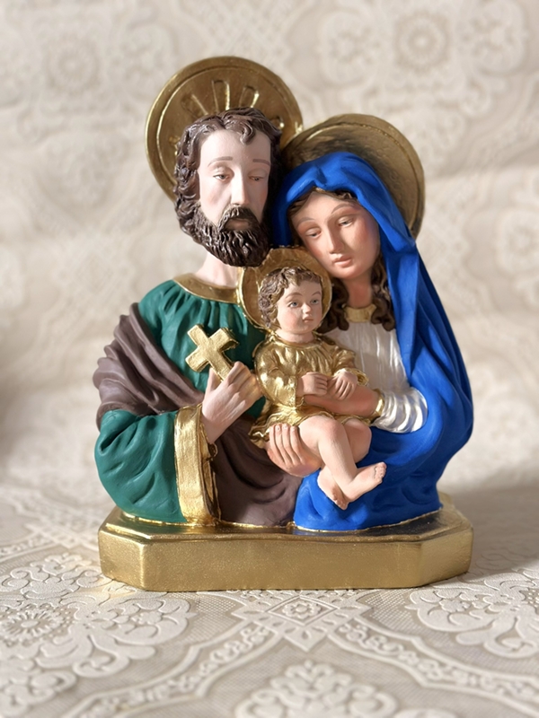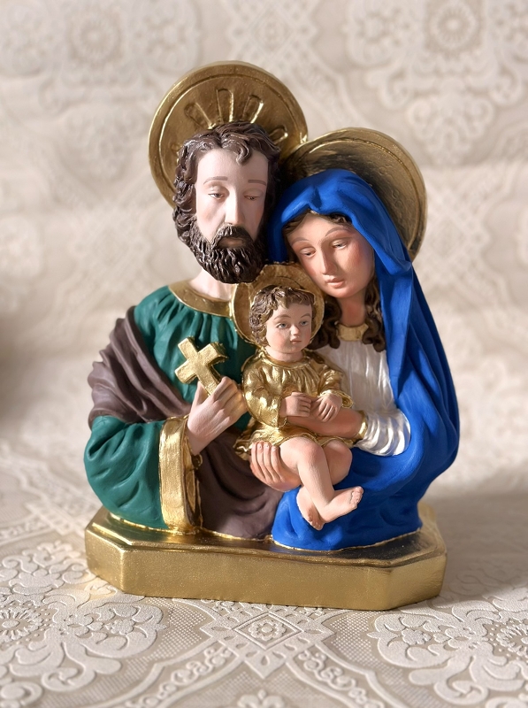 Busto de Sagrada Família 30cm todo feito em pintura acrílica colorida. Detalhes de rosto e cabelos são feitos em Carnação à óleo, que é uma pintura que deixa a peça mais realista.