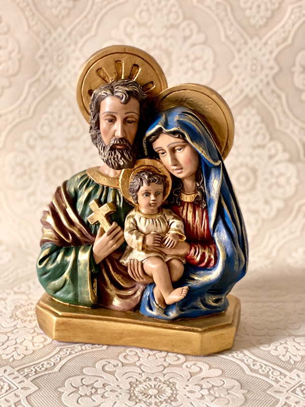 Busto de Sagrada Família 30cm toda feita em pintura acrílica envelhecida com pátina dourada.