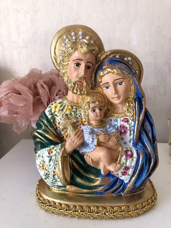 Busto de Sagrada Família com 20cm feito em pintura e Decoupage em Guardanapo. As estampas podem variar, consulte os modelos e cores de estampa chamando no botão do Whatsapp.