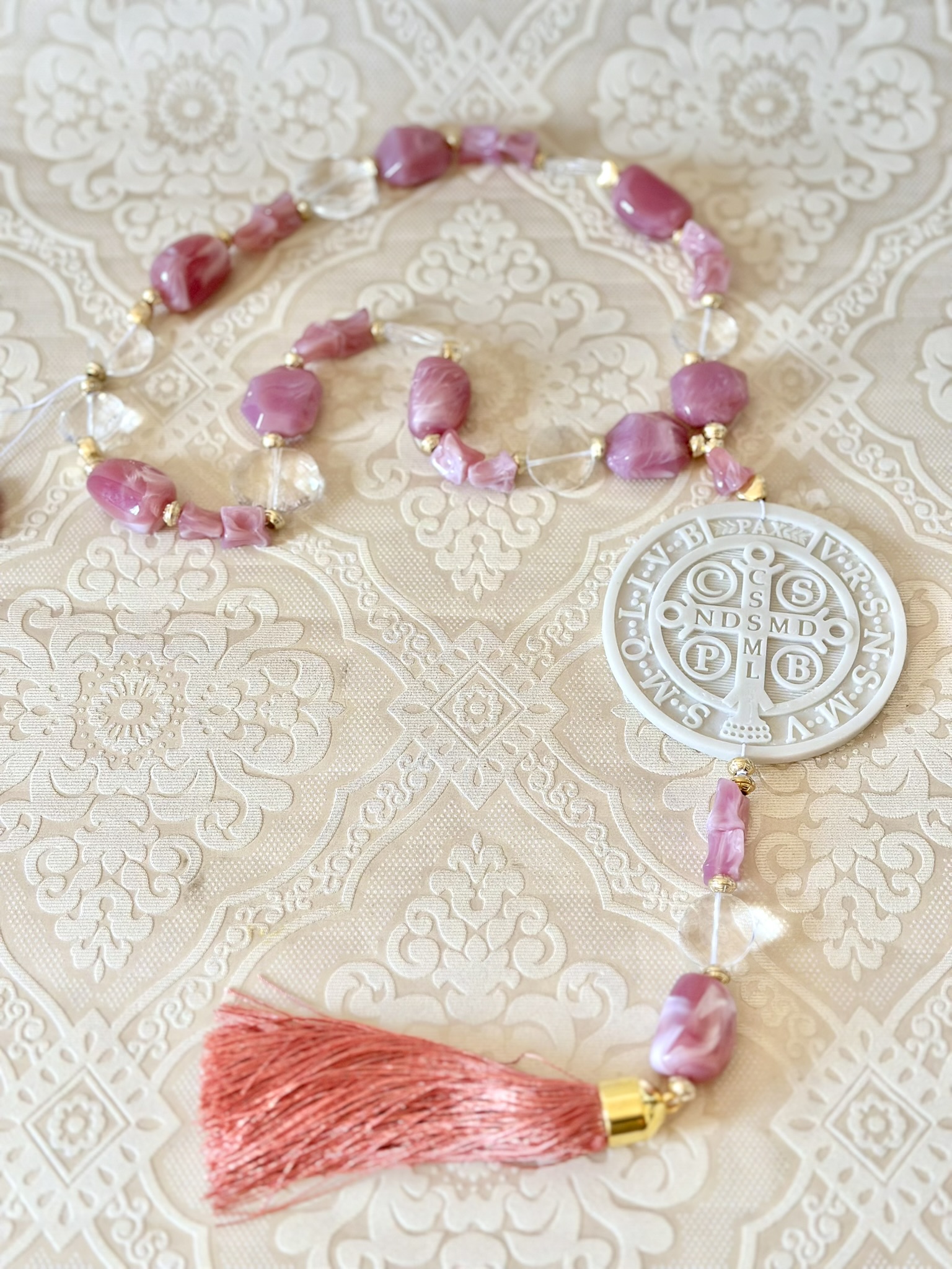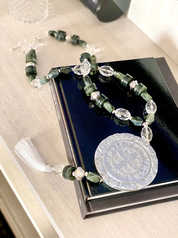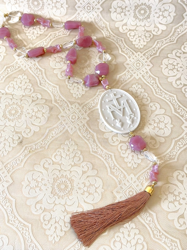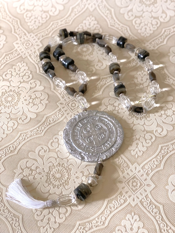 Colar de mesa tamanho G, em torno de 58cm de comprimento. Medalha modelo especial em resina de Nossa Senhora das Graças (medalha frente e verso), Nossa Senhora de Guadalupe ou São Bento (medalha frente e verso).
