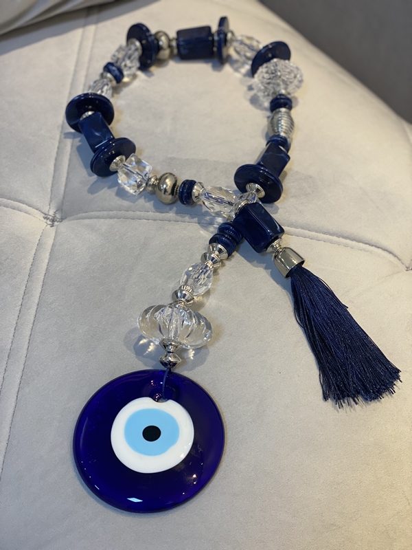 Colar de mesa tamanho G, em torno de 58cm de comprimento. Medalha de em Murano. Feito com pedras resinadas em azul marinho.