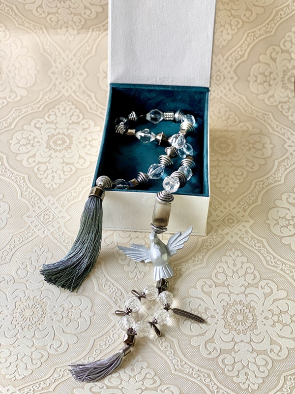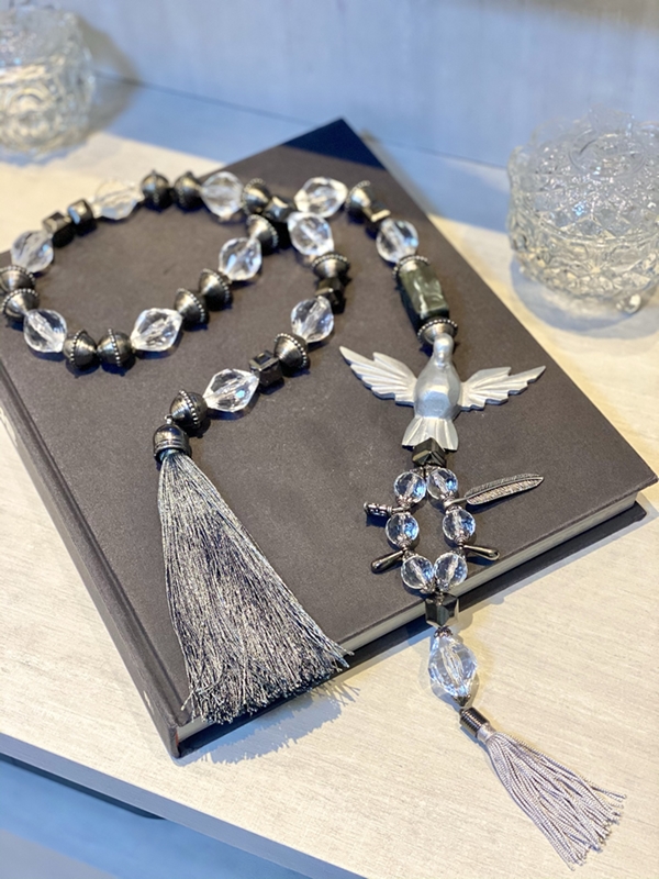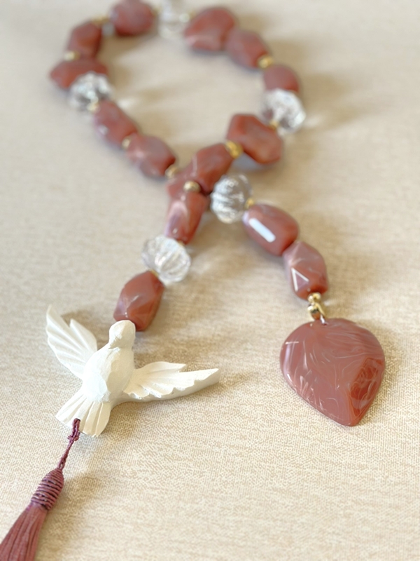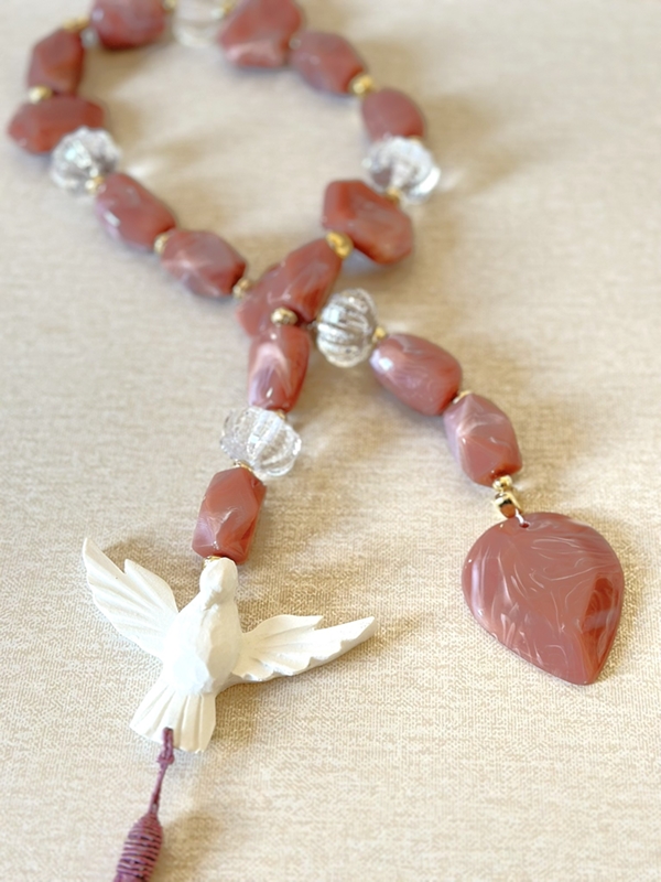 Colar de mesa tamanho G, em torno de 58cm de comprimento. Medalha de Divino Espírito Santo em resina branca. Feito com pedras resinadas em rosê.