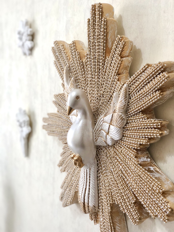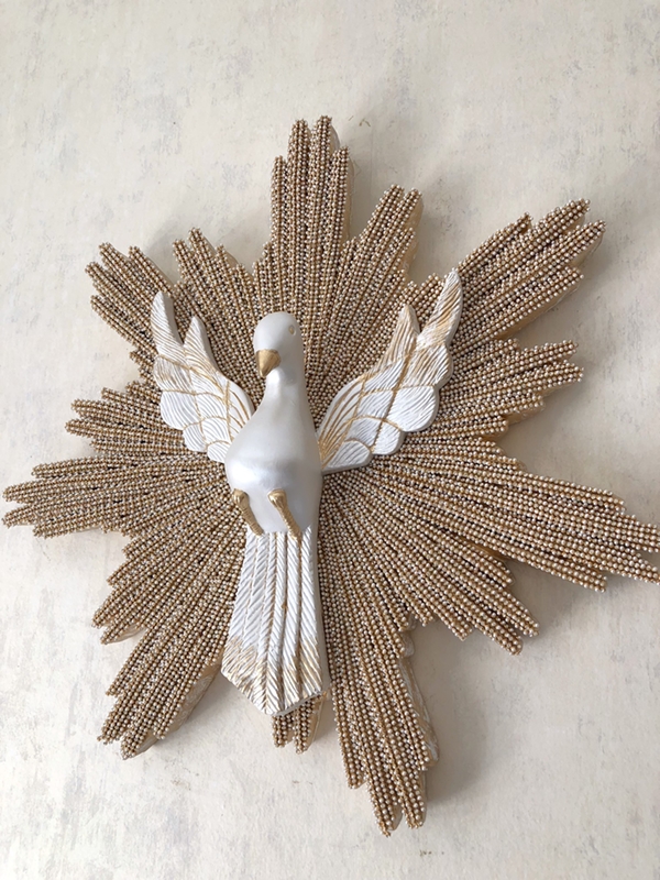 Imagem de Divino Espírito Santo com 50cm trabalhado em pintura dourada e resplendor inteiro em strass e pérolas.