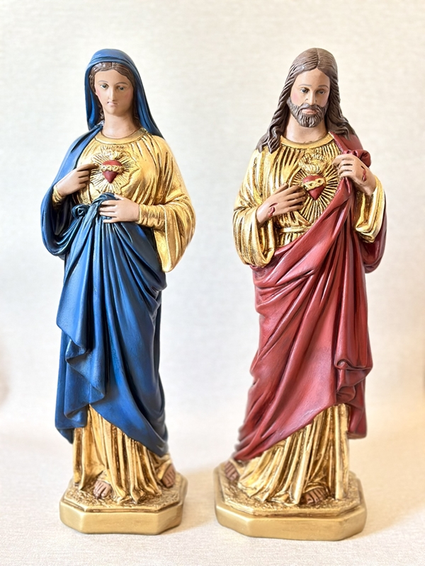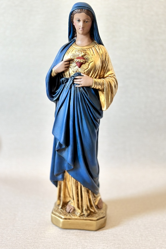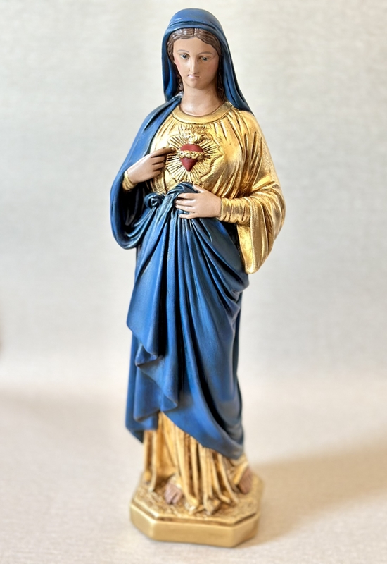 Imagem de Imaculado Coração de Maria com 40cm roupa toda feita em folha de ouro, manto em pintura acrílica azul mar e envelhecimento total. Todas as cores da imagem são personalizáveis de acordo com o seu gosto.