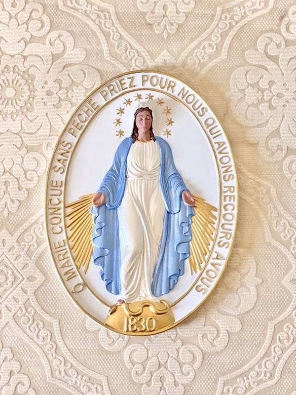 Medalha de pendurar de Nossa Senhora das Graças com 25cm, trabalhada em pintura acrílica nas cores clássicas e detalhes em dourado.