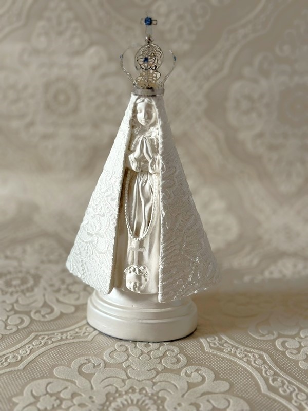 Imagem de Nossa Senhora Aparecida com 20cm trabalhada em pintura acrílica perolada e manto em renda com coroa de metal.