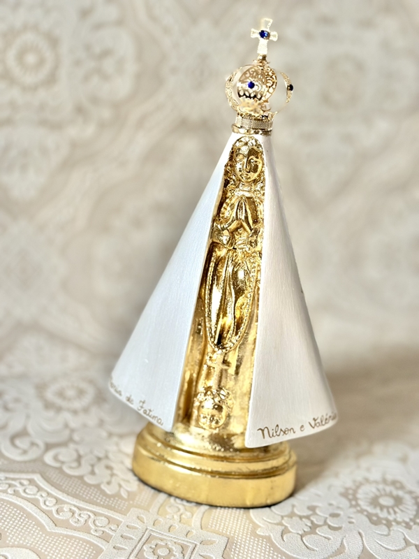 Imagem de Nossa Senhora Aparecida com 20cm toda feita em pintura acrílica, com nomes e dourado feito em folha de ouro.