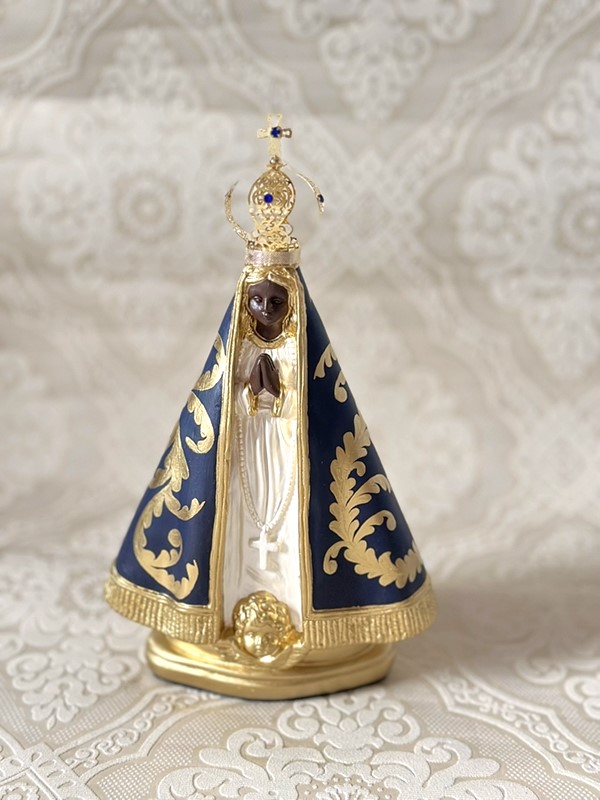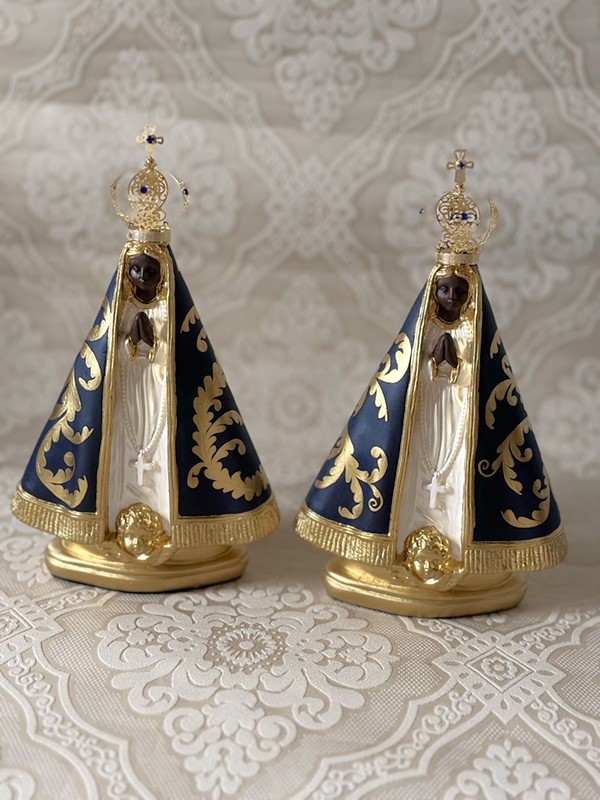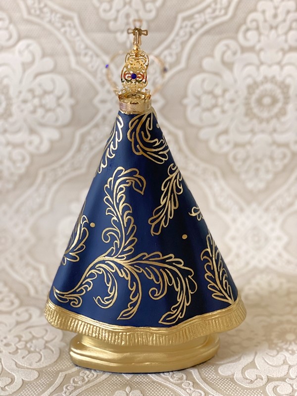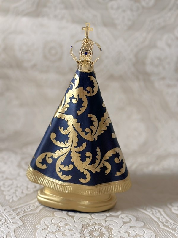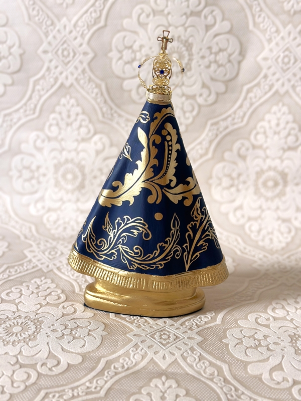 Imagem de Nossa Senhora Aparecida com 25cm toda feita em pintura acrílica, todos os desenhos são feitos a mão livre em tinta dourada em inspirações de arabescos barrocos. Esse é um tipo de estilização exclusiva pois os desenhos nunca saem iguais. Imagem com coroa de metal.