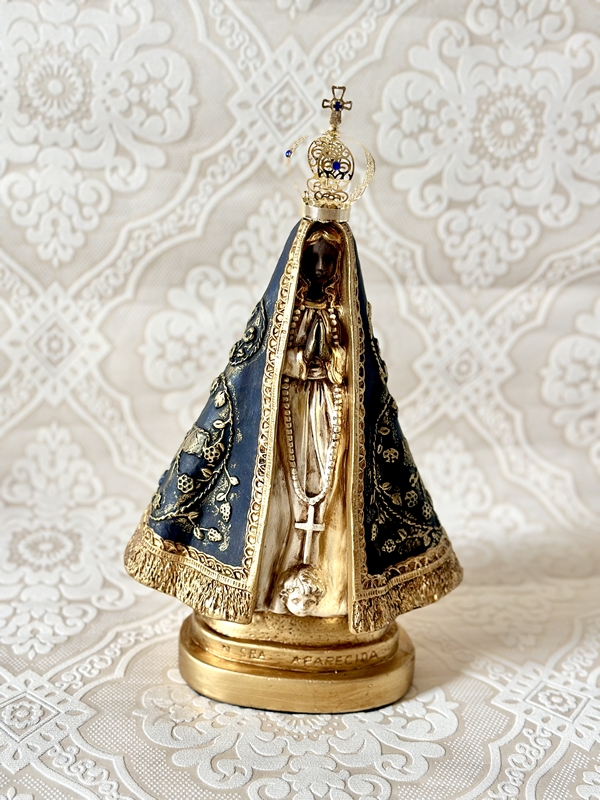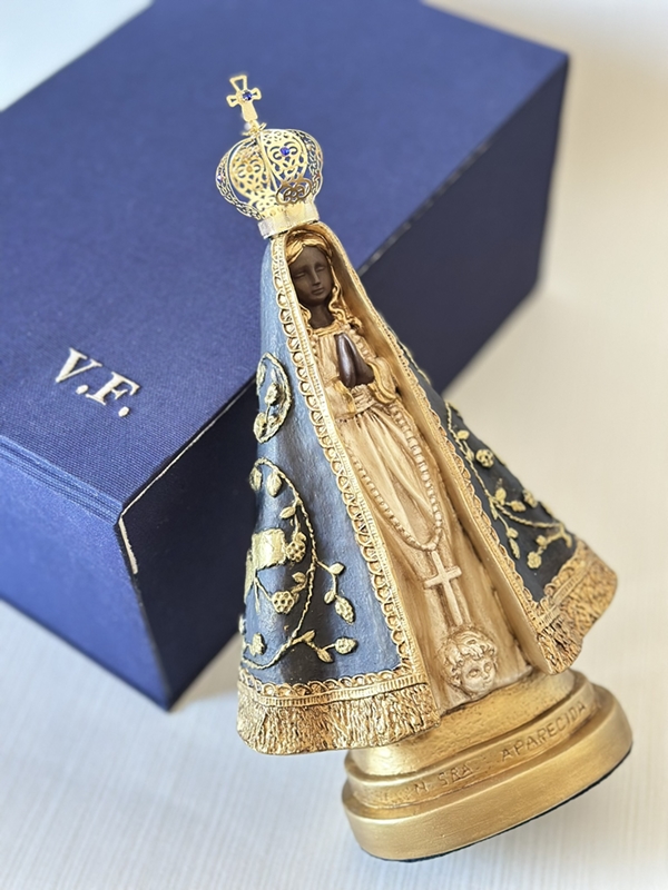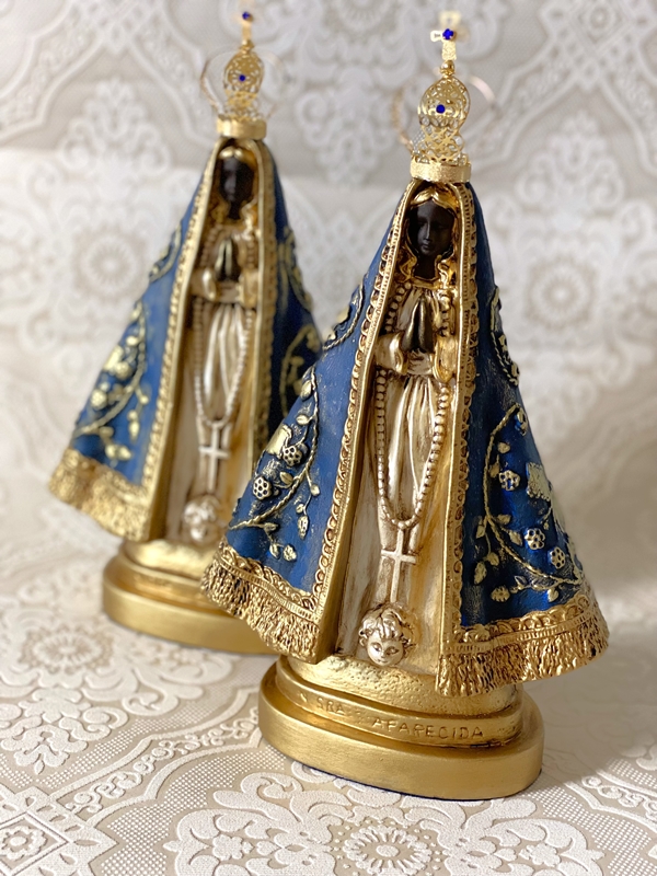 Imagem de Nossa Senhora Aparecida com 30cm toda feita em pintura acrílica,envelhecida, o dourado é feito todo em pátina dourada. Todas as cores da imagem são personalizáveis de acordo com o seu gosto. Coroa de metal.