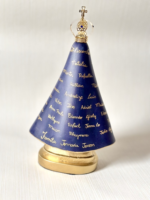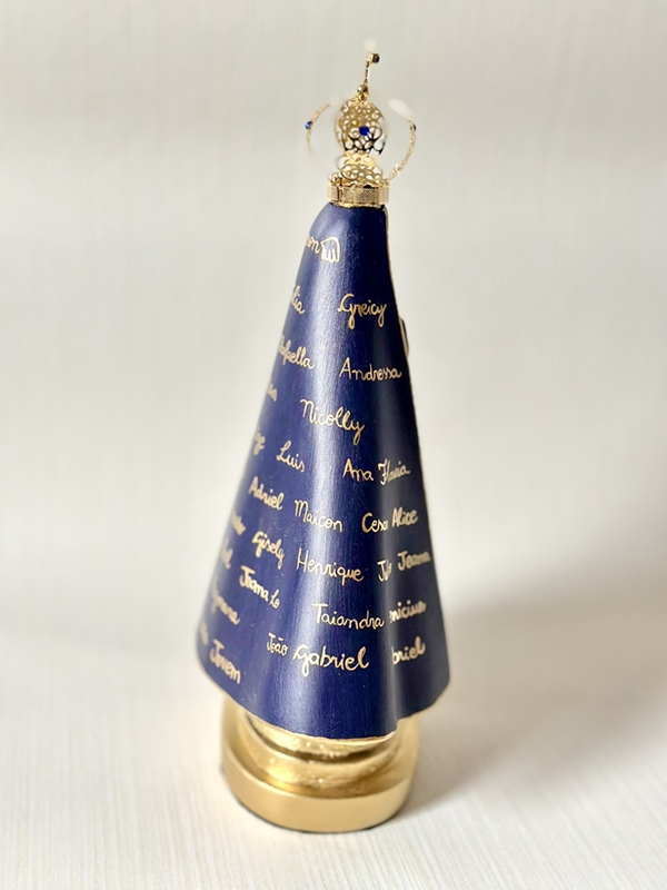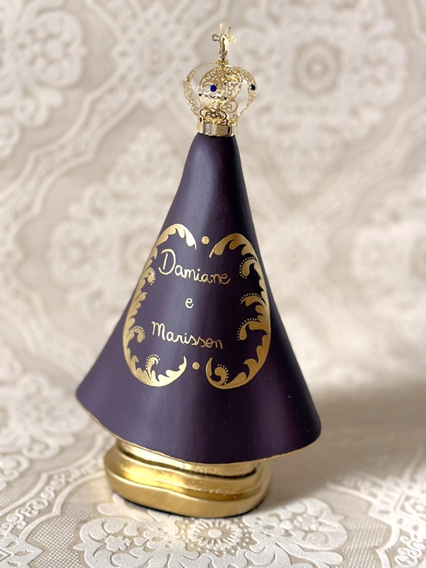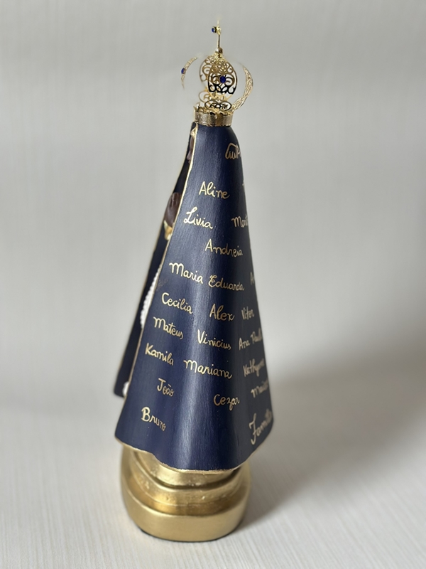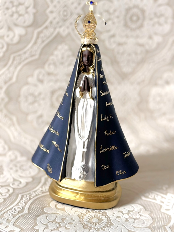 Imagem de Nossa Senhora Aparecida com 30cm toda feita em pintura acrílica são feitos até 50 nomes nesse tamanho de imagem. Quando a peça leva somente o nome do casal ou até 4 nomes, fazemos os ramos de arasbescos na lateral dos nomes.