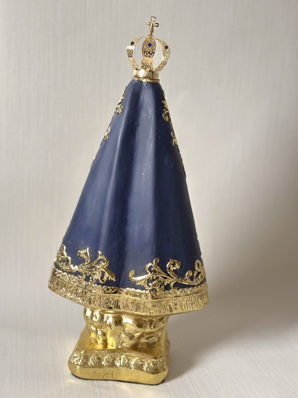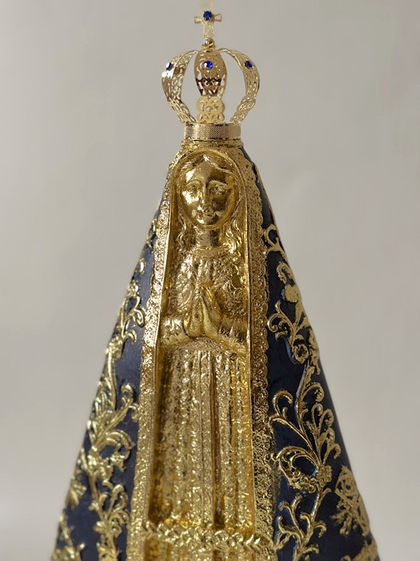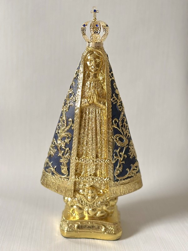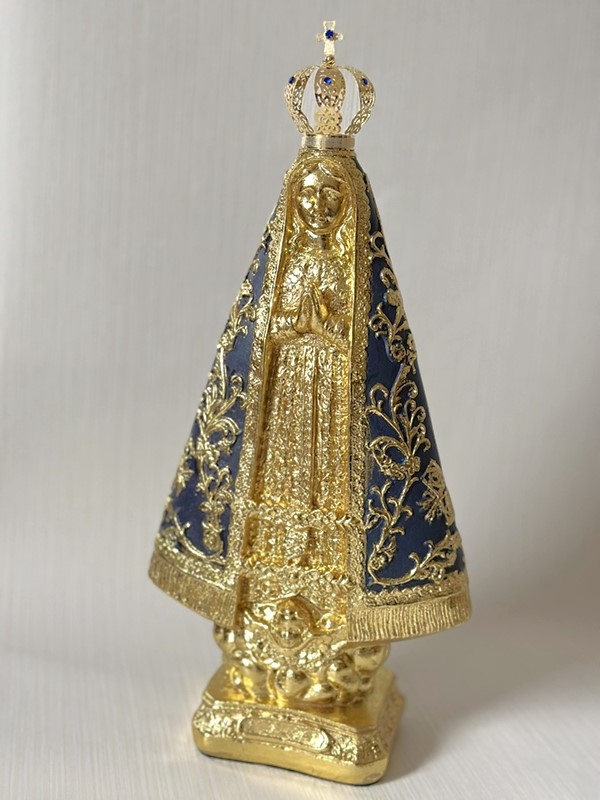 Imagem de Nossa Senhora Aparecida com 40cm toda feita em pintura acrílica envelhecida e dourado em folha de ouro. Todas as cores da imagem são personalizáveis de acordo com o seu gosto. Coroa de metal.