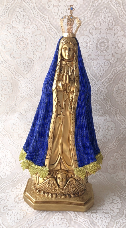 Imagem de Nossa Senhora Aparecida com 60cm pintura dourada envelhecida e manto em strass azul.