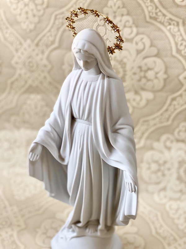Imagem de Nossa Senhora das Graças de 30cm em Pó de Mármore branco com auréola de metal com banho de ouro e predrinhas de strass.