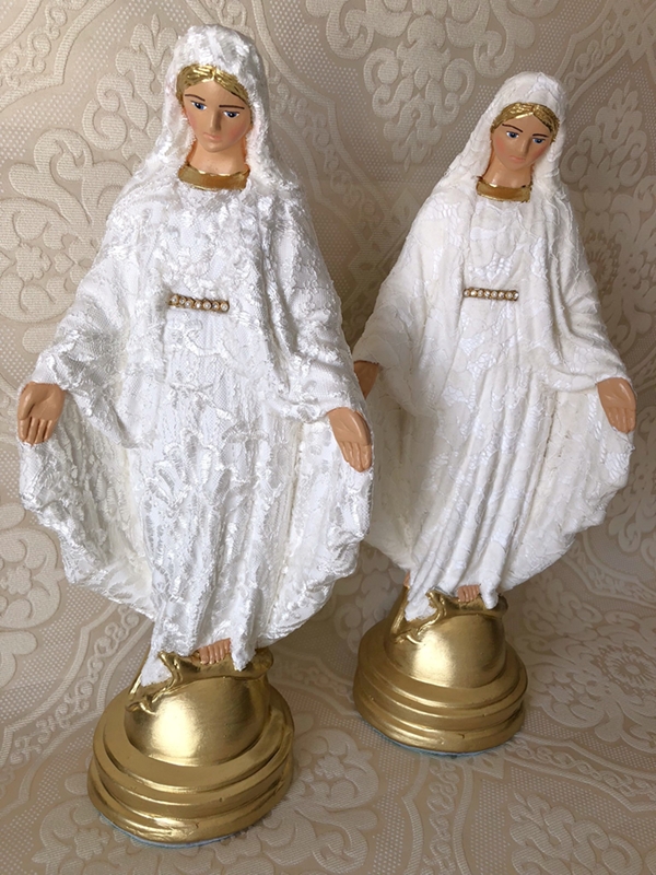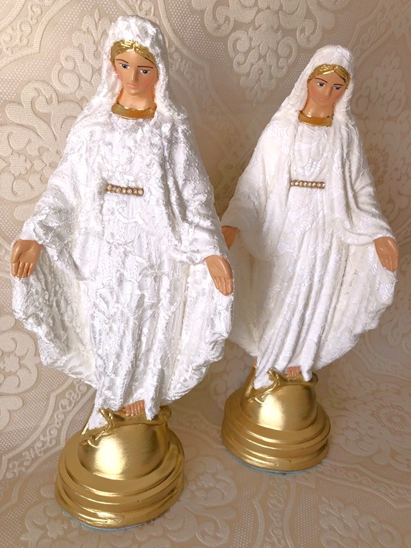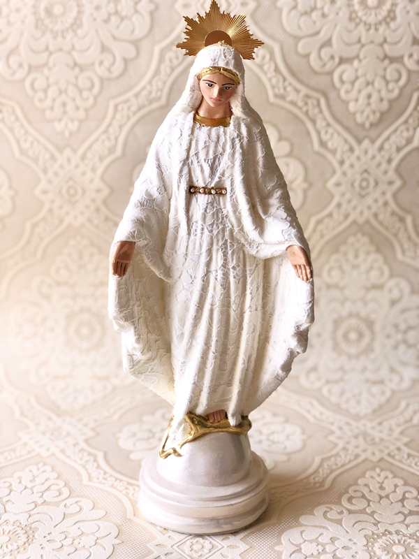 Imagem de Nossa Senhora das Graças com 30cm trabalhada inteira em renda sem bordado de pedrarias, com resplendor raiado.