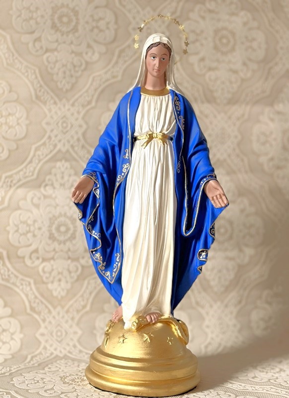 Imagem de Nossa Senhora das Graças com 40cm toda feita em pintura acrílica azul mar e detalhes e desenhos feitos a mão livre na lateral do manto, com auréola. Todas as cores da imagem são personalizáveis de acordo com o seu gosto.