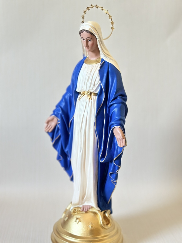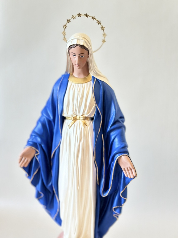 Imagem de Nossa Senhora das Graças com 40cm toda feita em pintura acrílica azul mar e detalhes de filetes em pintura dourada, com auréola. Todas as cores da imagem são personalizáveis de acordo com o seu gosto.