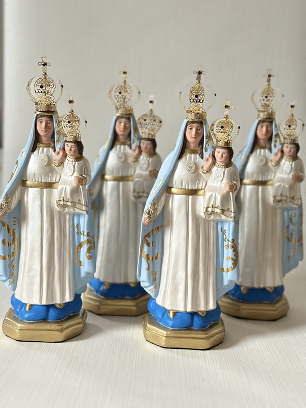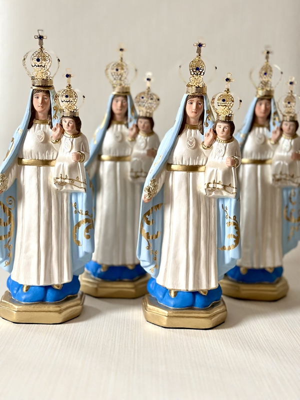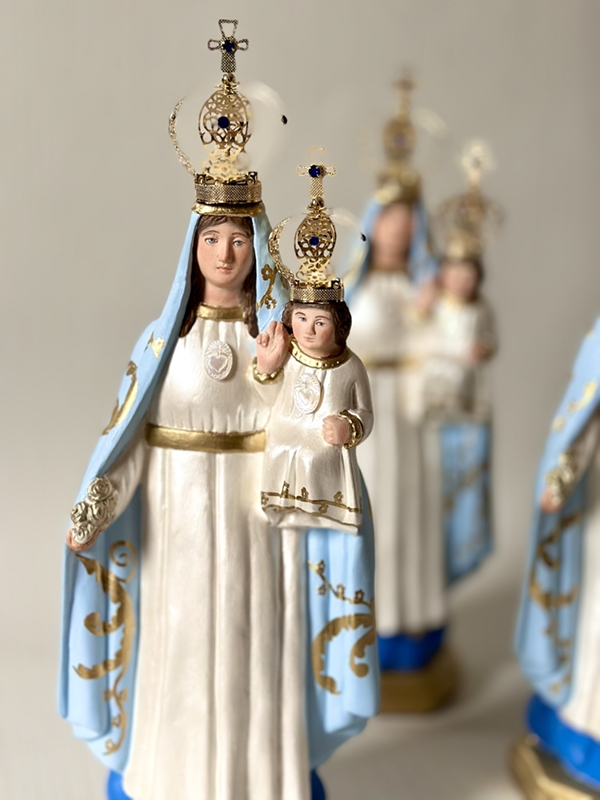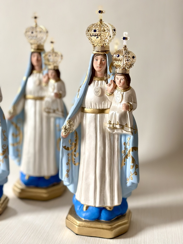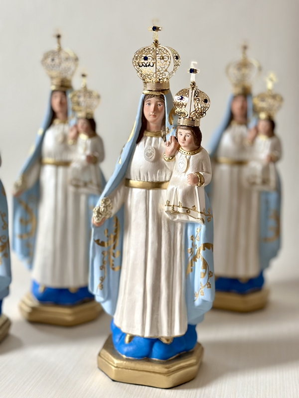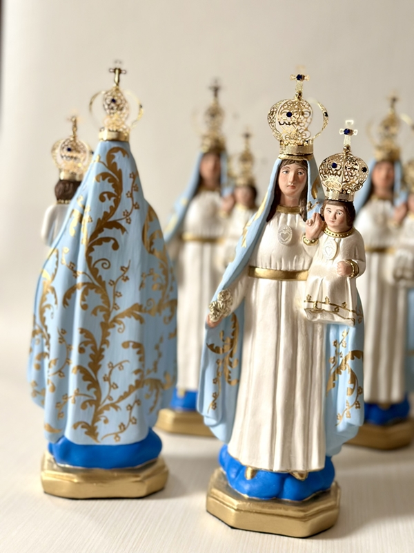 Imagem de Nossa Senhora do Brasil com 30cm toda trabalhada em pintura acrílica nas cores branco metalizado, azul claro. Todos os desenhos foram feitos a mão livre em pintura dourada.