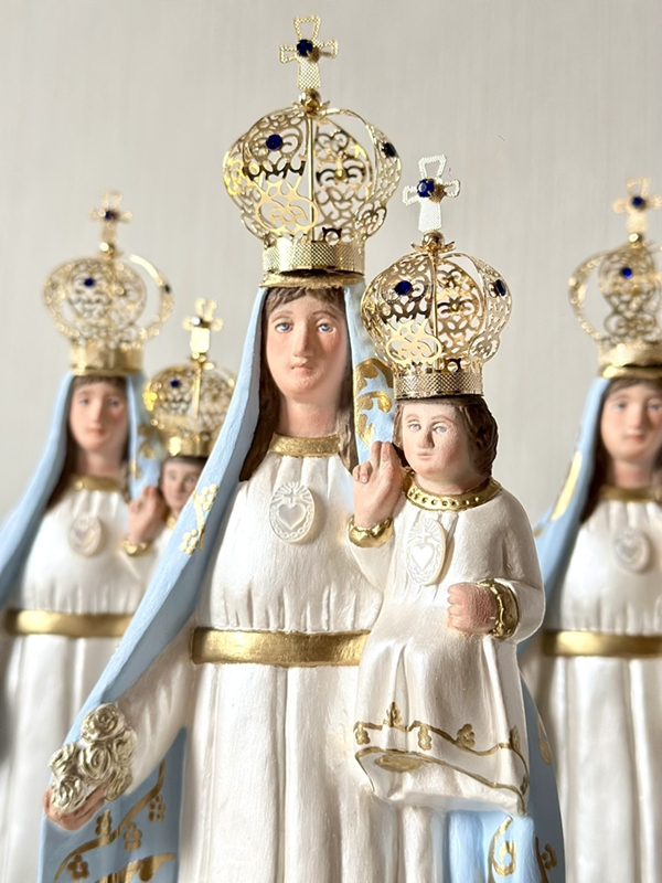 Detalhe especial para o Sagrado Coração que foi aplicado em madrepérola no peito da Nossa Senhora e do Menino Jesus.