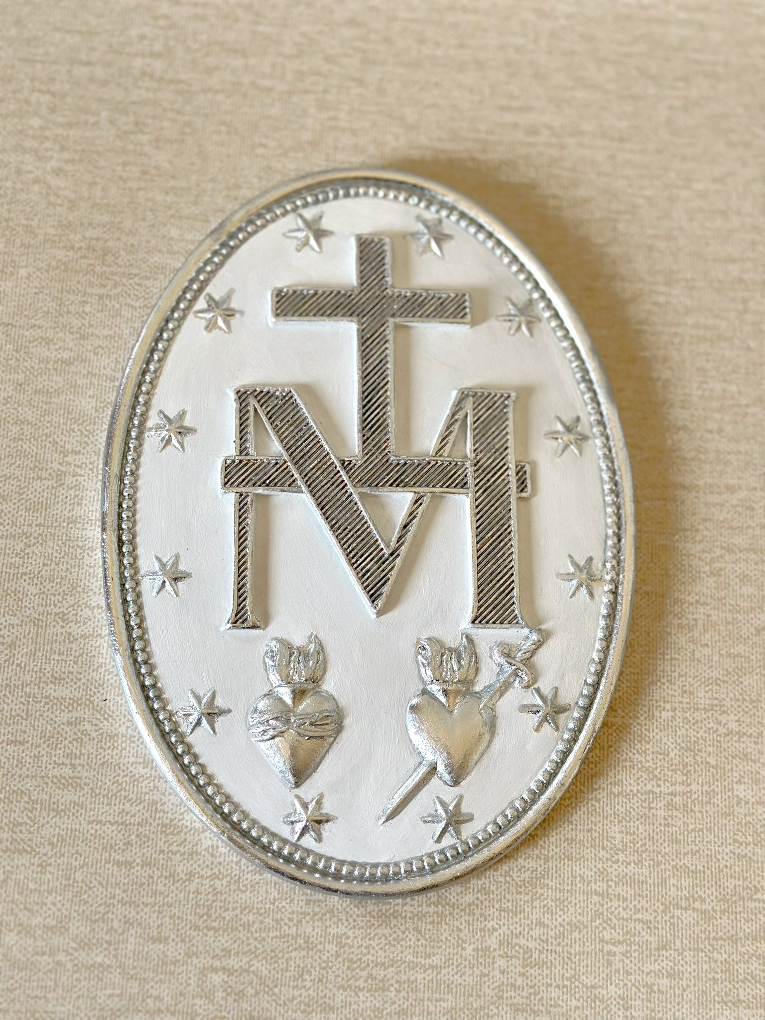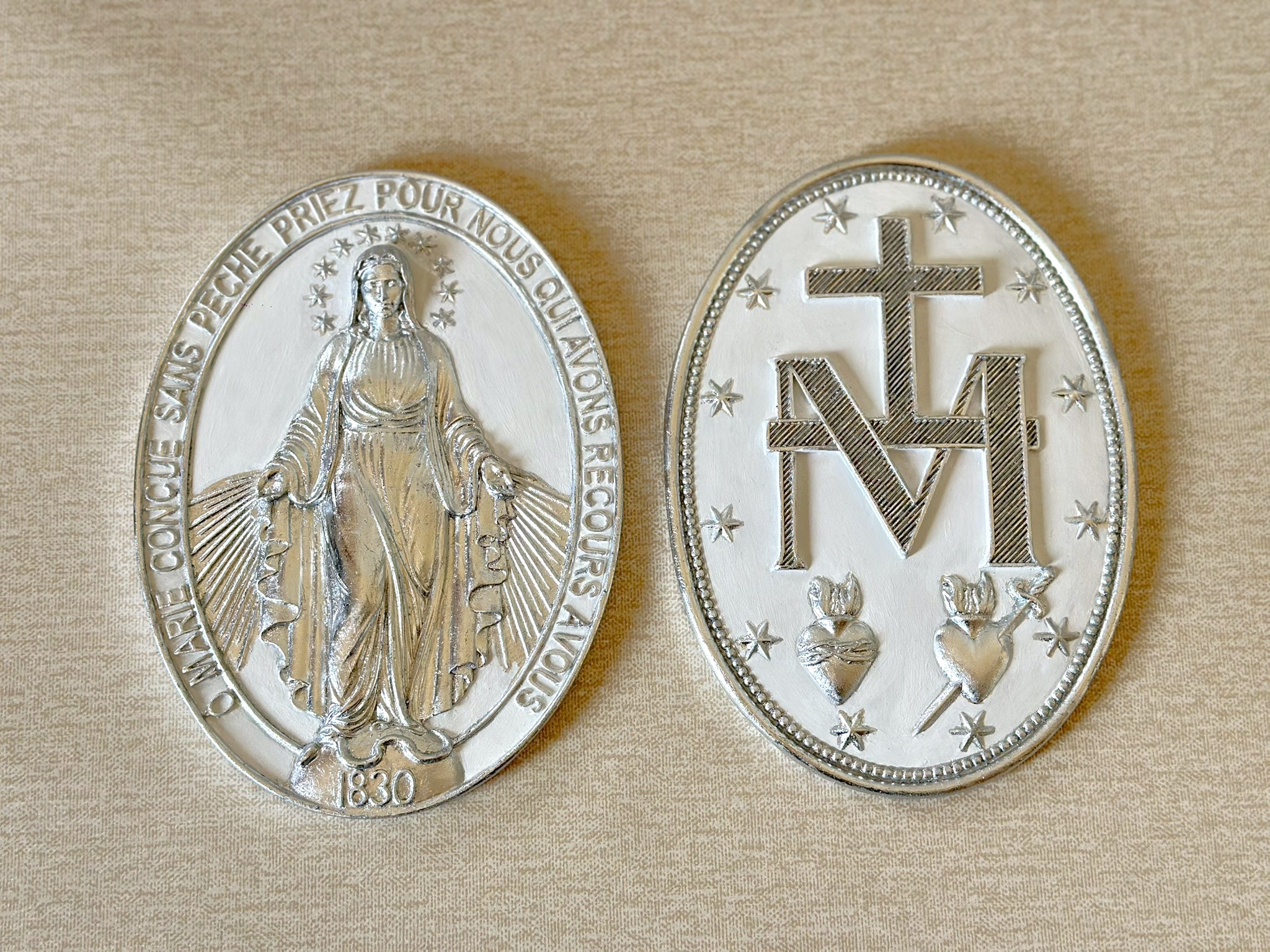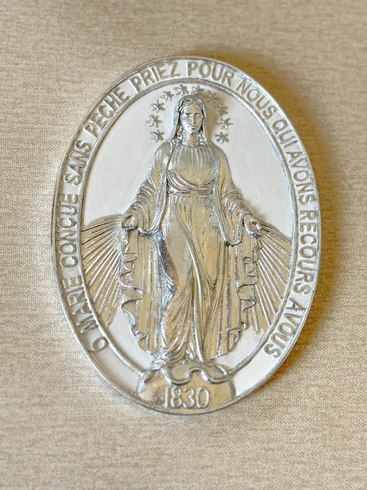 Medalha de pendurar de Nossa Senhora das Graças com 25cm, frente e verso, ambas trabalhadas em folha de prata. Folha de prata importada da Itália.