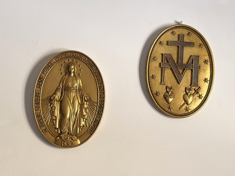 Medalha de pendurar de Nossa Senhora das Graças com 25cm, frente e verso, ambas trabalhadas em pintura dourada com envelhecimento.