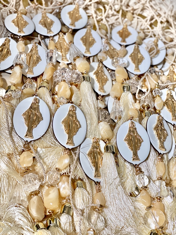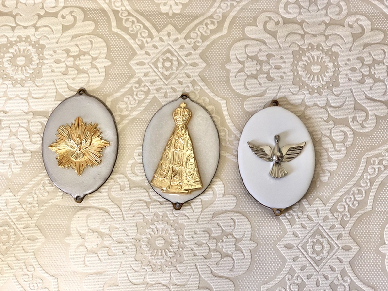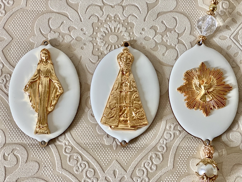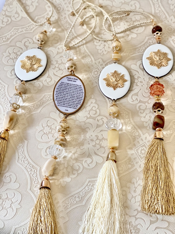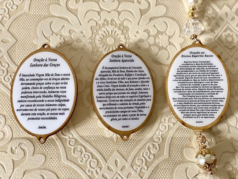 Pingente de porta com medalhas em Madeira com imagens diversas na parte da frente da medalha e, na parte de trás a oração da imagem.