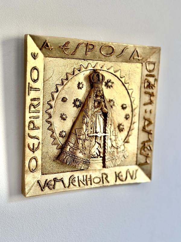 Placa de pendurar de Nossa Senhora Aparecida com 25cm trabalhada em folha de ouro importada da Itália e envelhecimento.