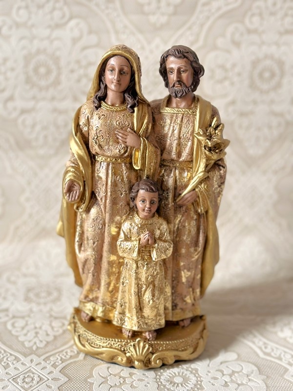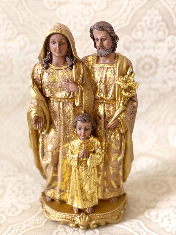 Imagem de Sagrada Família 30cm toda feita em pintura acrílica nude envelhecida e detalhes em pátina dourada e folha de ouro.
