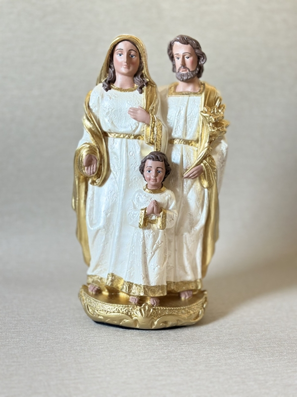 Imagem de Sagrada Família 30cm toda feita em pintura acrílica perolada e detalhes em dourado.