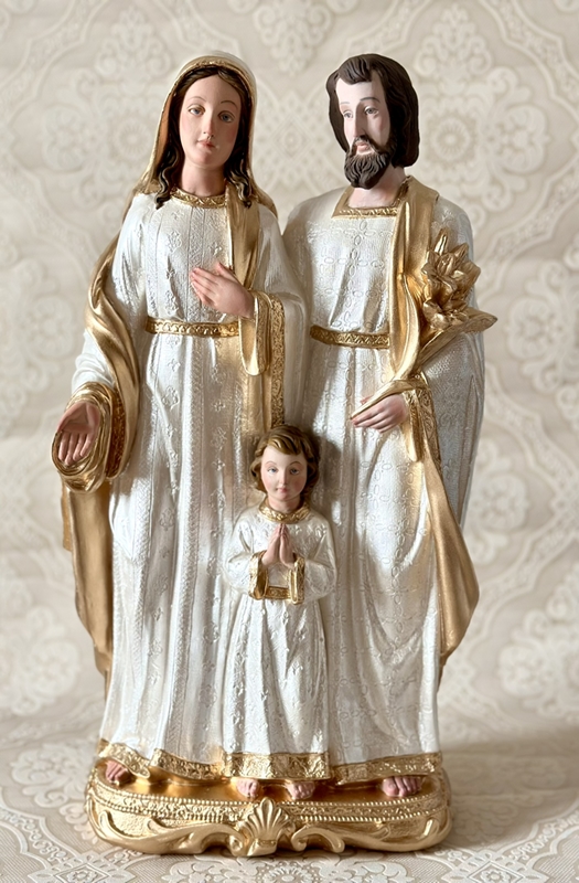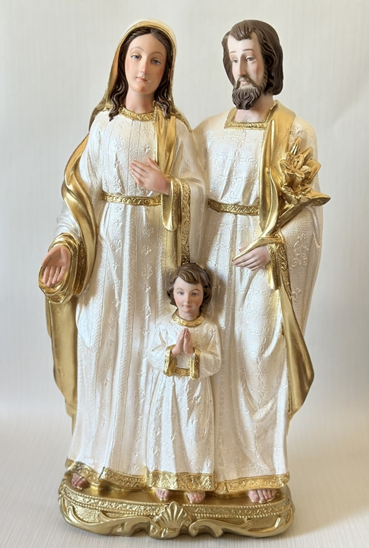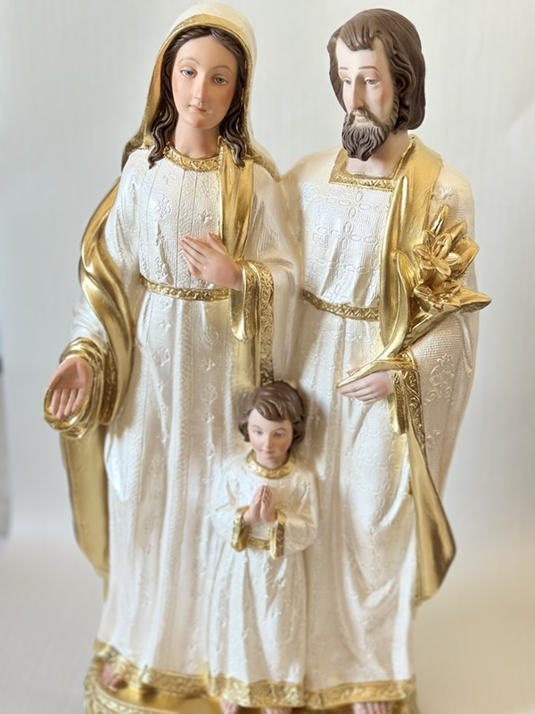 Imagem de Sagrada Família 60cm toda feita em pintura acrílica perolada. Detalhes de rosto e cabelos são feitos em Carnação à óleo, que é uma pintura que deixa a peça mais realista.
