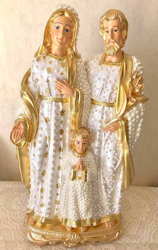 Imagem de Sagrada Família 60cm toda feita em pintura acrílica perolada e manto e detalhes de roupas em pérolas.