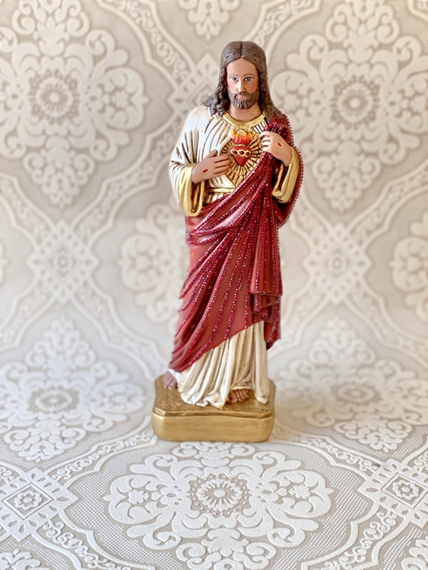 Imagem de Sagrado Coração de Jesus com 30cm em pintura envelhecida e detalhes no manto com fio de strass.