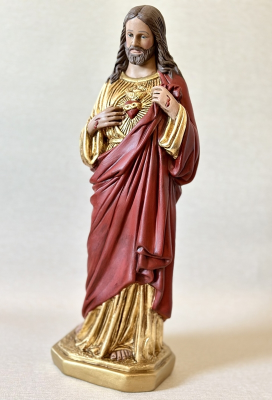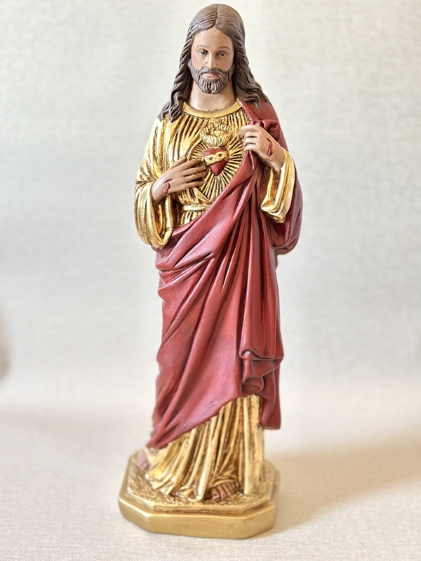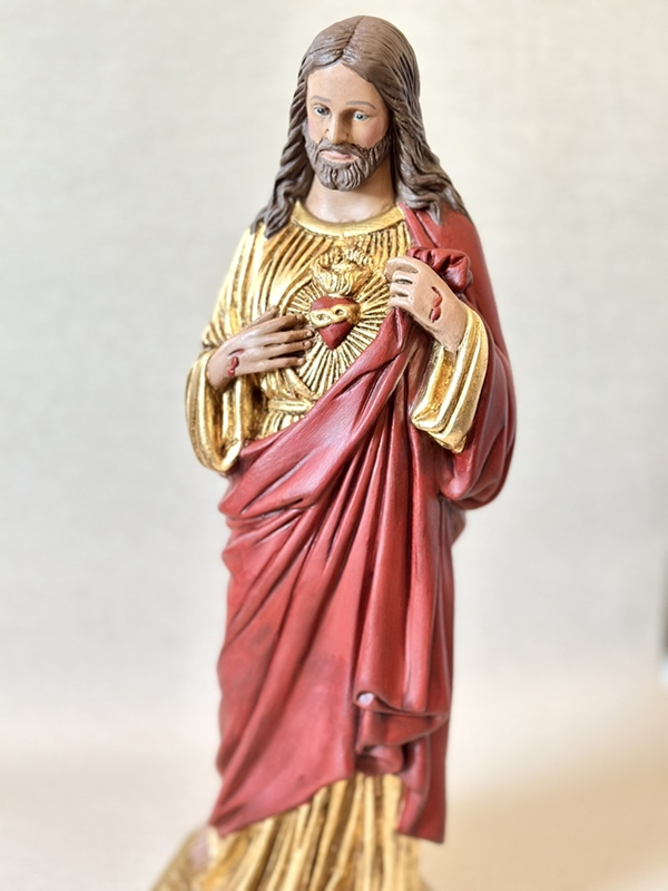 Imagem de Sagrado Coração de Jesus com 40cm roupa toda feita em folha de ouro, manto em pintura acrílica vermelha e envelhecimento total. Todas as cores da imagem são personalizáveis de acordo com o seu gosto.