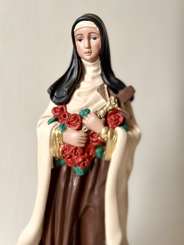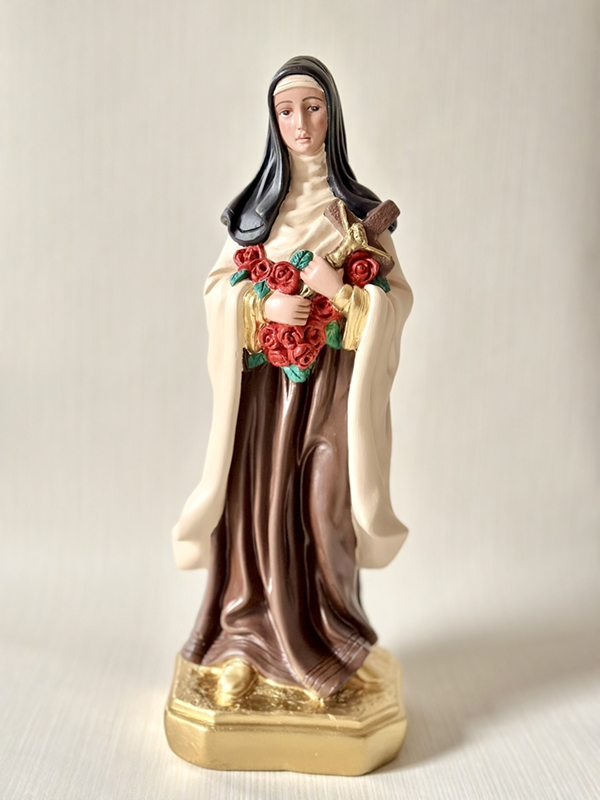 Imagem de Santa Terezinha com 40cm toda feita em pintura acrílica nas cores clássicas. Todas as cores da imagem são personalizáveis de acordo com o seu gosto.