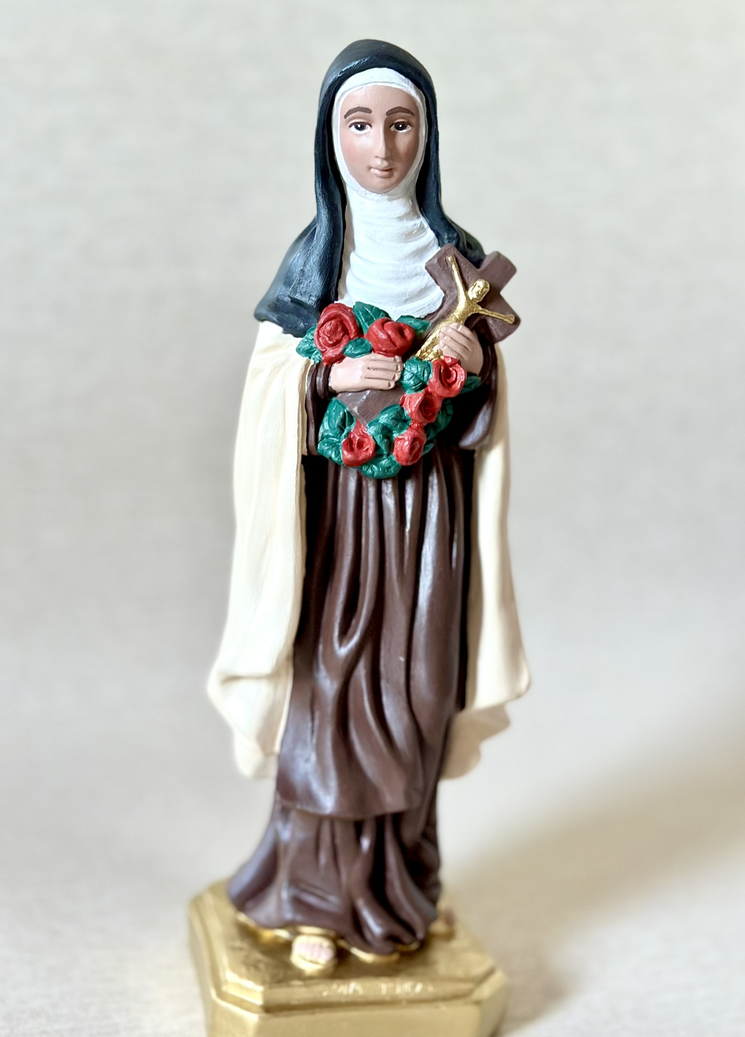 Imagem de Santa Terezinha com 30cm toda feita em pintura acrílica envelhecida.