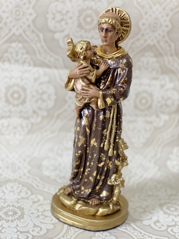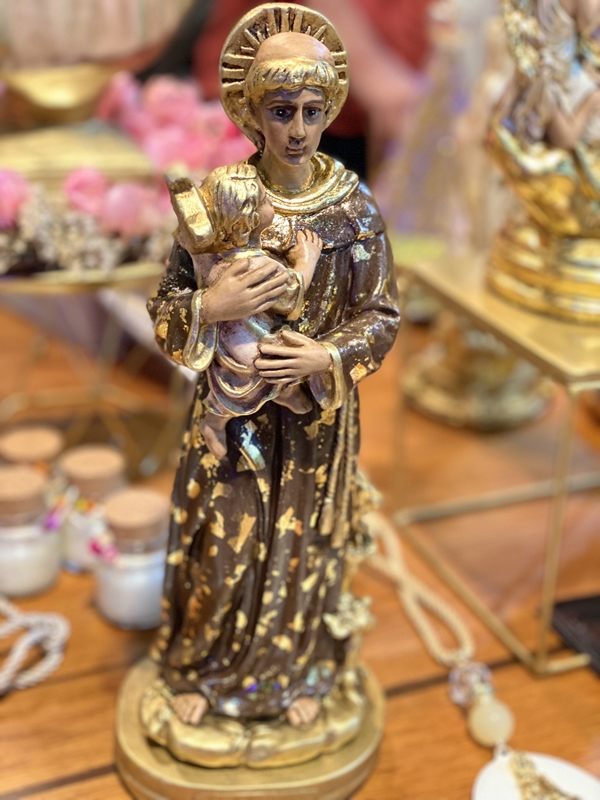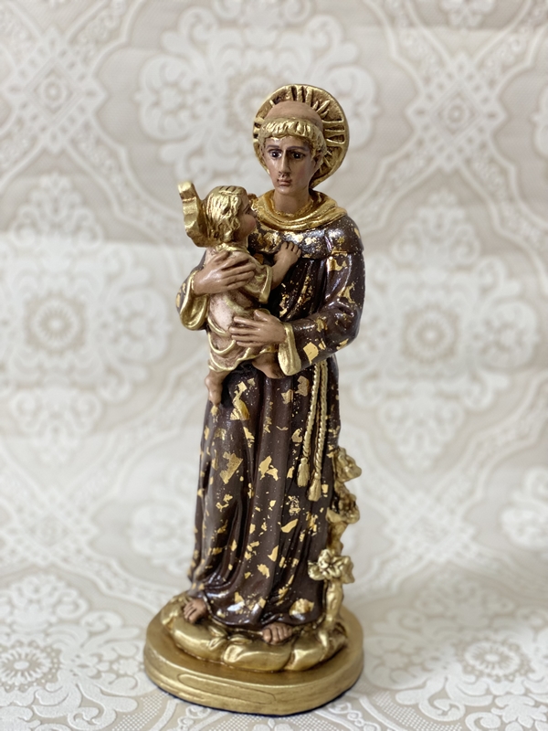 Imagem de Santo Antônio com 30cm toda feita em pintura acrílica envelhecida com folha de ouro. Todas as cores da imagem são personalizáveis de acordo com o seu gosto.