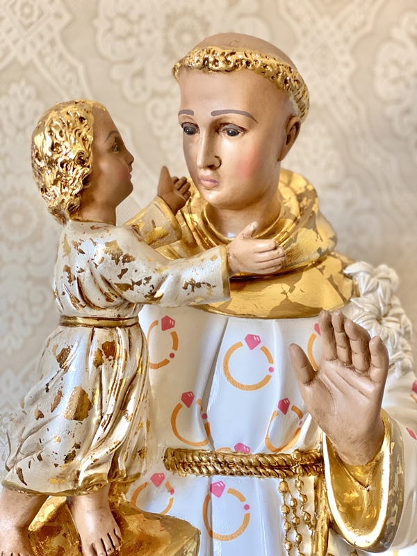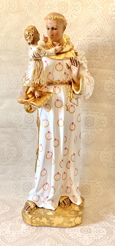 Imagem de Santo Antônio com 80cm feita em Decoupage em Guardanapo. Estampa especialmente desenvolvida para o Casar.com. O restante da imagem levou pintura acrílica dourada e pele que foram envelhecidas (essa imagem não possui carnação à óleo no rosto), todo o dourado e a roupa do menino Jesus possuem folhas de ouro.