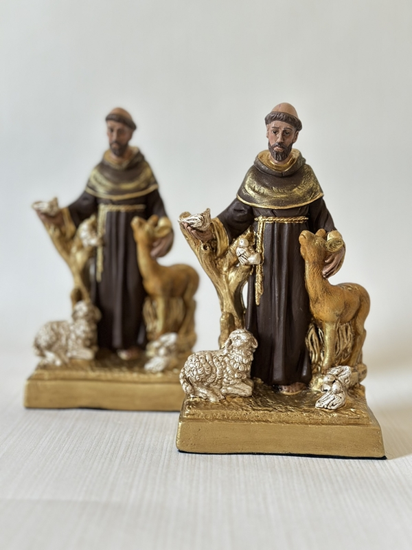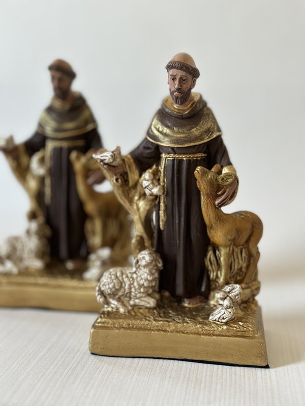 Imagem de São Francisco de Assis com 20cm toda feita em pintura marrom e detalhes em pátina dourada. Todas as cores da imagem são personalizáveis de acordo com o seu gosto.